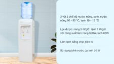 Với công suất làm lạnh 65W, công suất làm nóng 500W, cây nước nhanh chóng cung cấp nước nóng để bạn uống, pha cà phê, pha trà, nấu mì,... và mang đến cho bạn những cốc nước mát lạnh sử dụng mọi lúc.Hệ thống làm lạnh bằng chíp điện tử. Bình chứa nước lạnh dung tích 0.6 lít làm bằng nhựa cao cấp bền bỉ, an toàn khi dùng, dung tích bình chứa nước nóng 0.8 lít.2 công tắc khởi động nấu nước nóng và làm lạnh