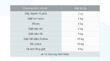 Chương trình giặt: | Giặt nhẹ Chăn mền Sấy gió 90 phút Giặt Xả Vắt Giặt nhanh Giặt thường Đồ trẻ em Tiết kiệm nước Giặt ngâm Vệ sinh lồng giặt |