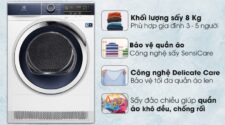 Máy sấy Electrolux có khối lượng sấy 8 kg, phục vụ tốt cho gia đình có từ 3 - 5 người trong những ngày mưa lớn kéo dài hay nhà không có khu vực phơi đồ