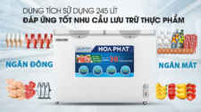 Tủ đông Hoà Phát có dung tích sử dụng 245 lít, đáp ứng tốt nhu cầu lưu trữ thực phẩm và phù hợp cho gia đình hoặc các cửa hàng ăn uống nhỏ với 2 ngăn riêng biệt:Ngăn đông dung tích 128 lít (-18 độ C): Bảo quản thực phẩm tươi sống như thịt, cá hoặc đông lạnh kem, sữa chua,...Ngăn mát dung tích 117 lít (0 -10 độ C): Ướp lạnh nước giải khát, hoa quả, rau củ,…
