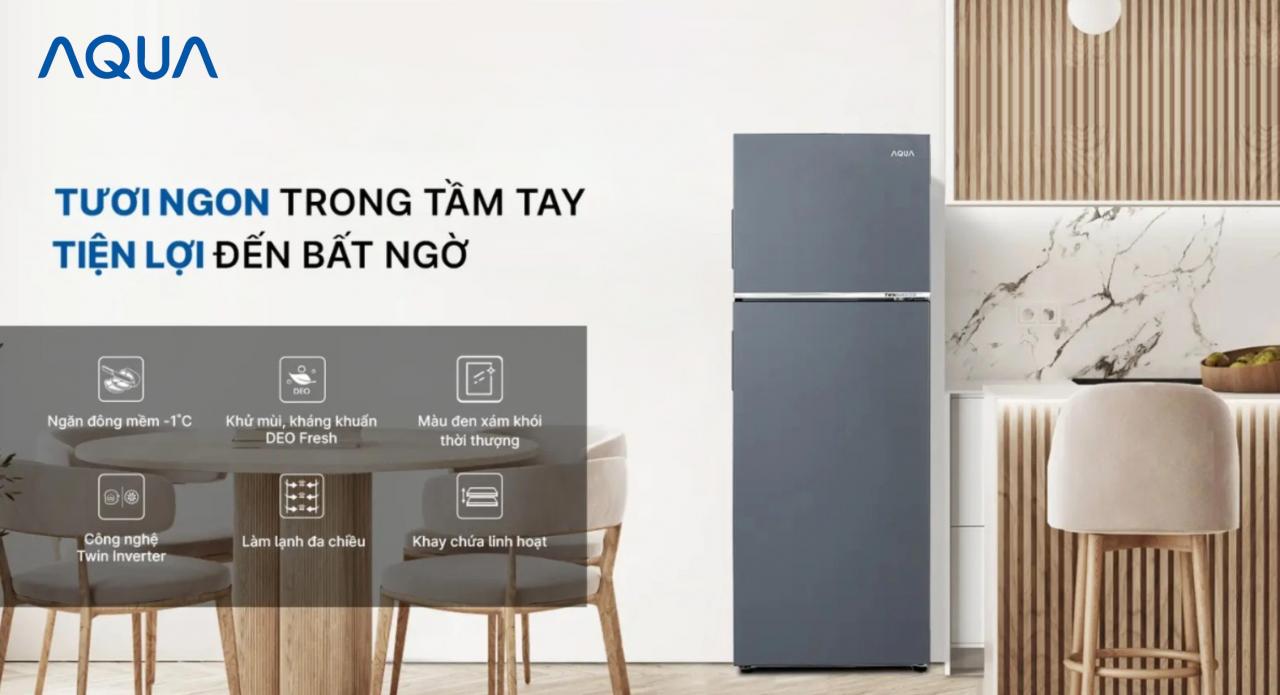 - Tủ lạnh Aqua hoạt động êm ái, bền bỉ, tiết kiệm hiệu quả điện năng nhờ có công nghệ Twin Inverter.