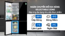 - Ngăn chuyển đổi đa năng Selectable Zone cho phép bạn dễ dàng tùy chỉnh nhiệt độ cài đặt phù hợp với từng loại thực phẩm và nhu cầu lưu trữ.+ Soft Freeze (đông mềm) khoảng -3°C: bạn có thể nấu ăn ngay mà không mất thời gian rã đông thực phẩm.+ Freezer (Đông lạnh) khoảng -18°C đến -20°C.+ Ngăn mát 3°C: tăng thêm không gian bảo quản đồ ăn, thức uống.+ Ngăn lạnh 1°C: bảo quản các sản phẩm từ bơ/sữa, thịt và thực phẩm tươi ở mức nhiệt độ lý tưởng.